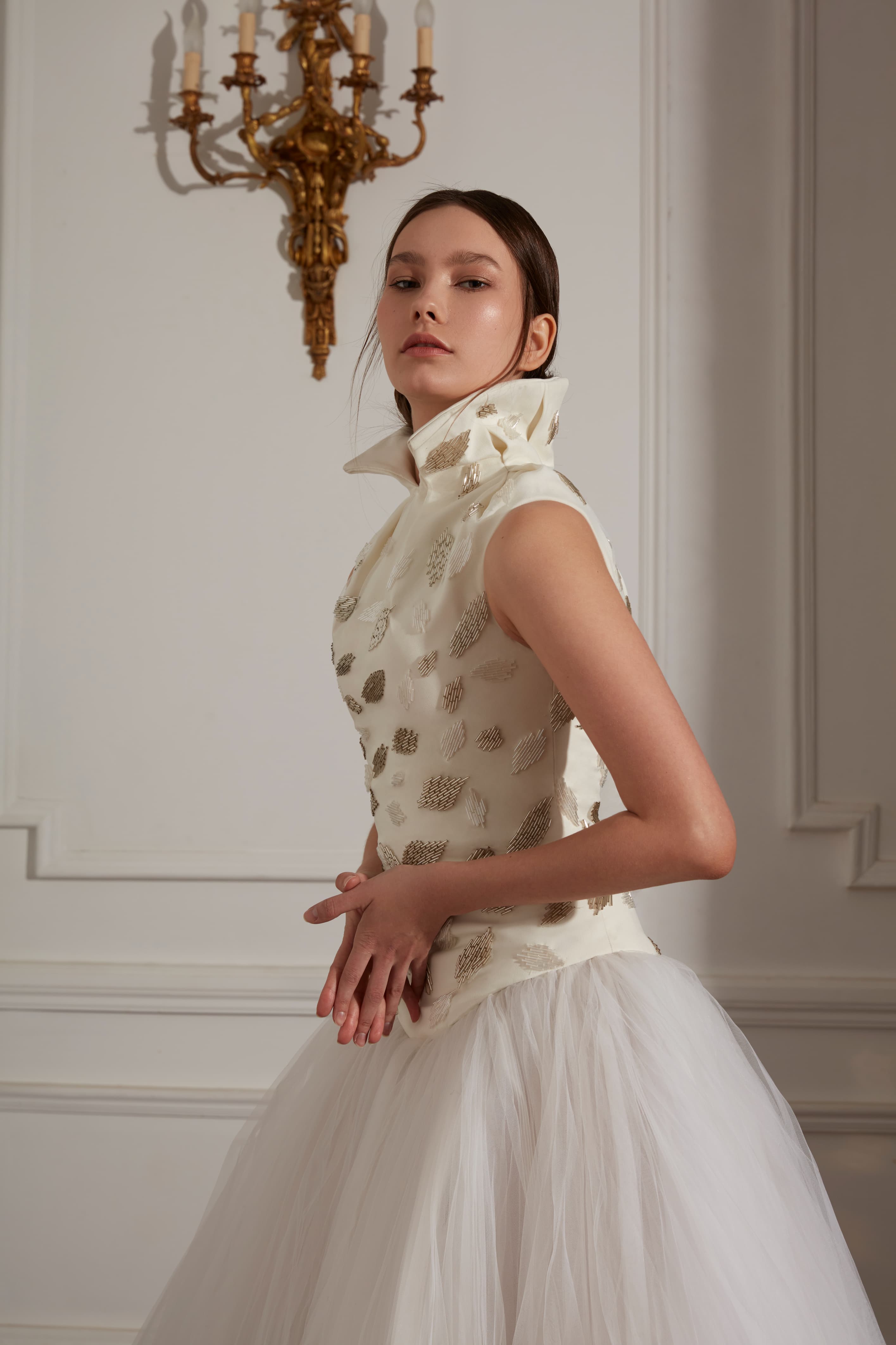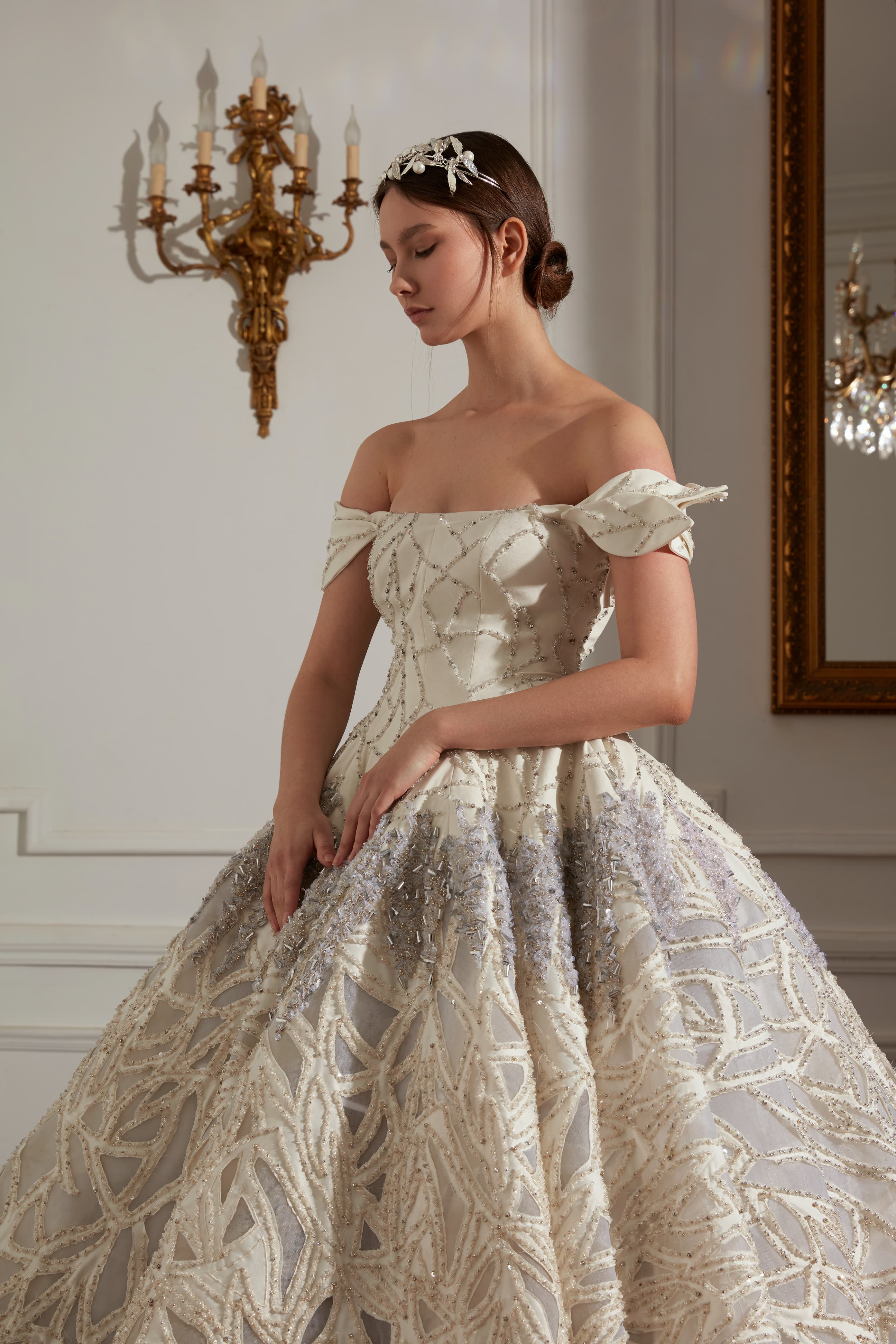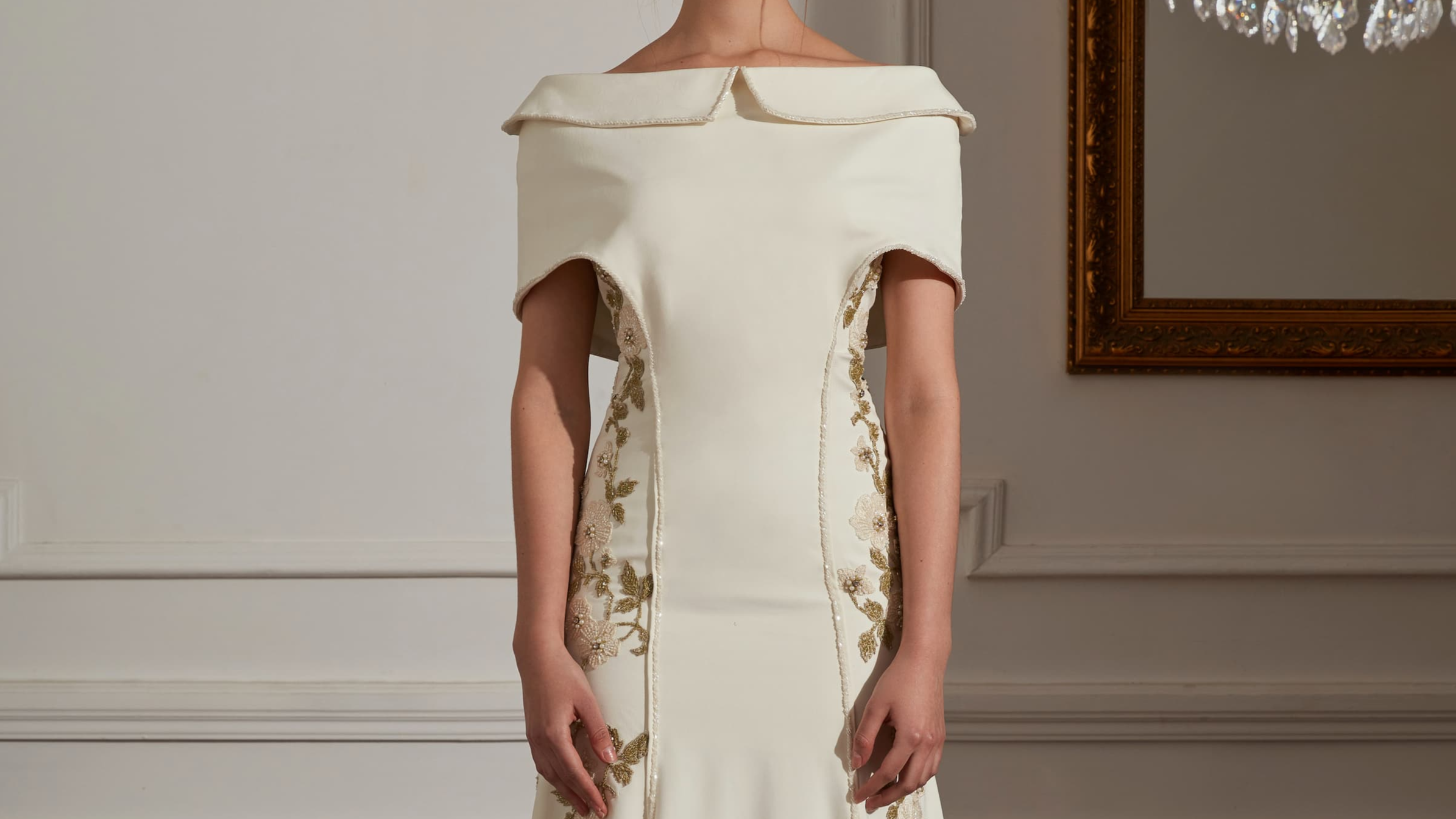 This collection features intricate hand-embroidered bee motifs, luxurious crepe, lace, and tulle fabrics, gold and silver handcrafted accessories, and structured yet flowing silhouettes, all brought together in a regal palette of gold, white, and soft grays, embodying elegance and strength.