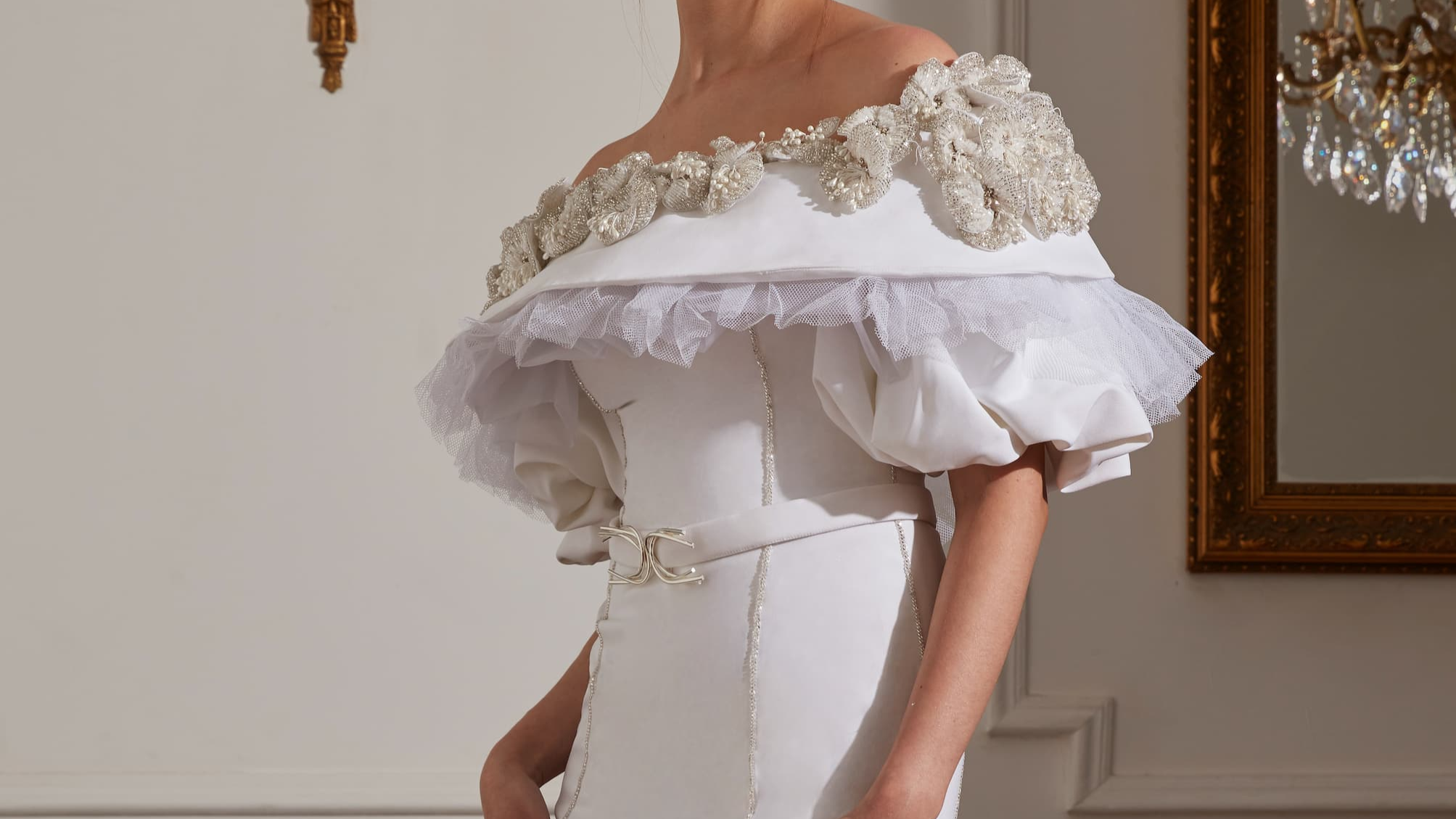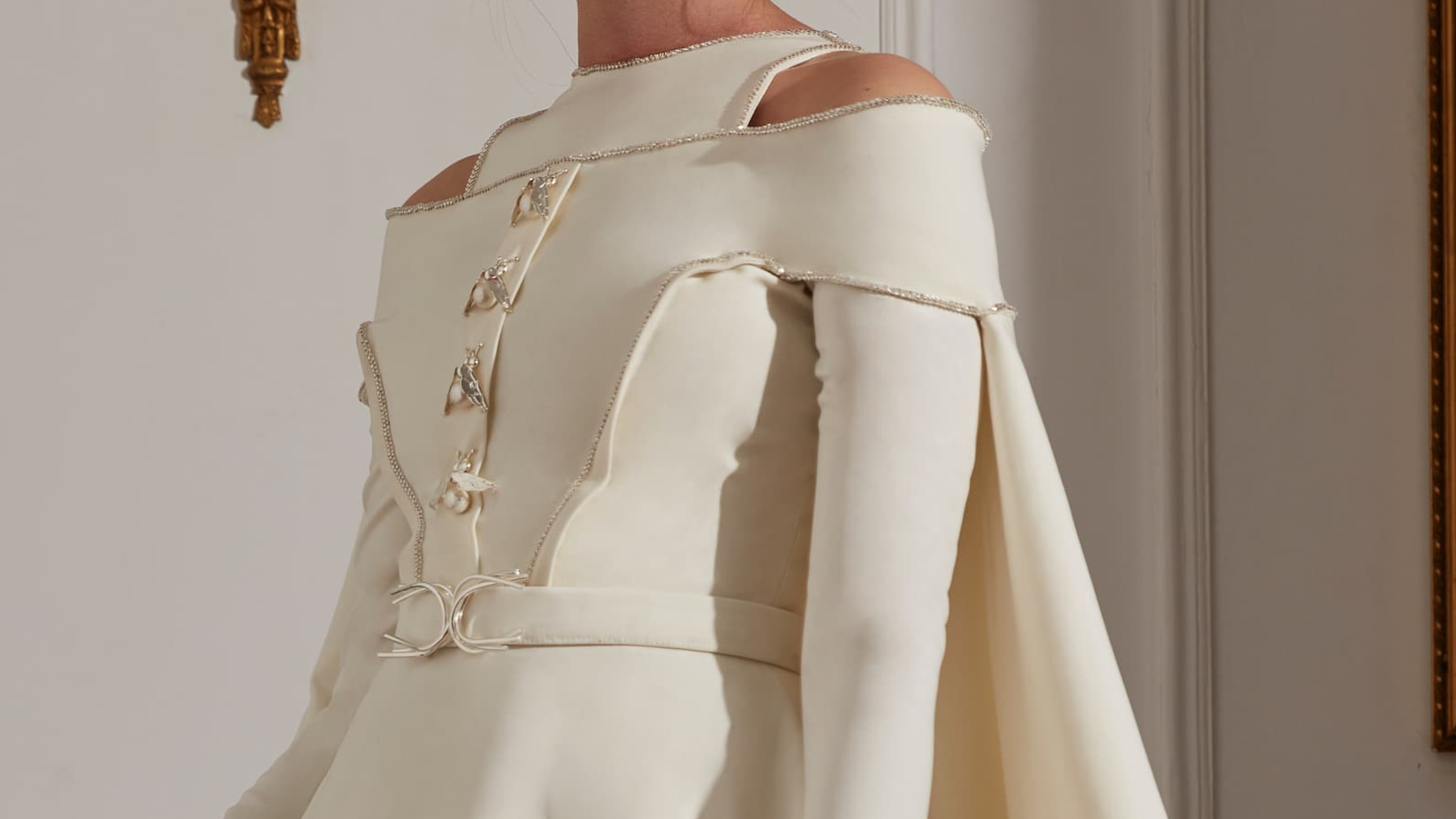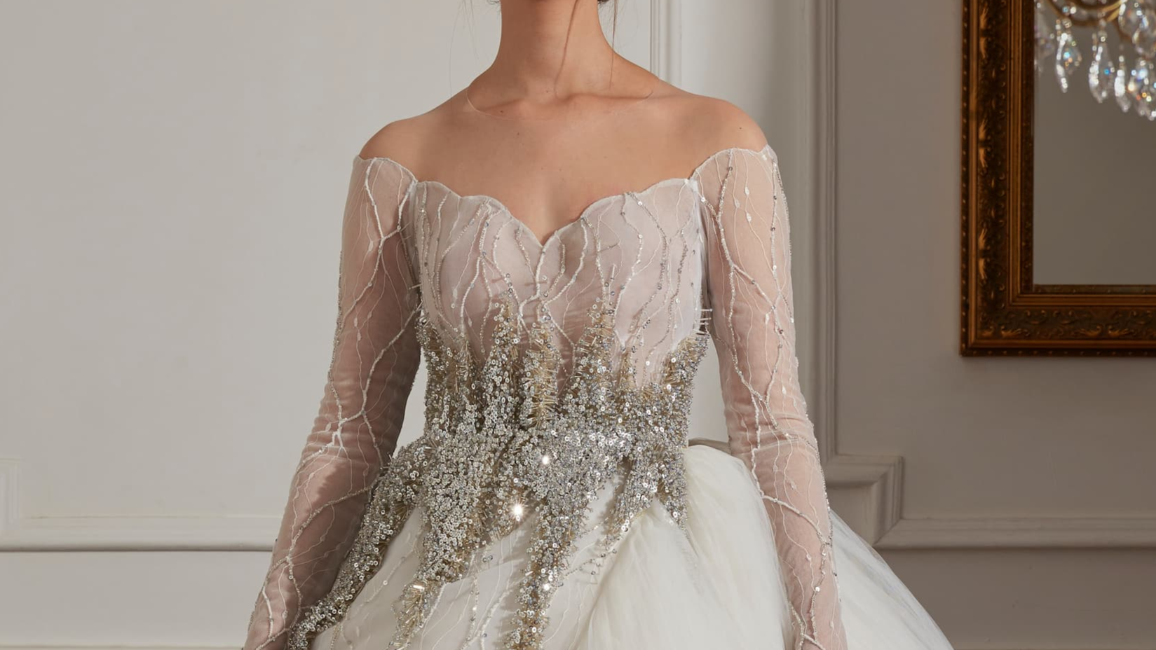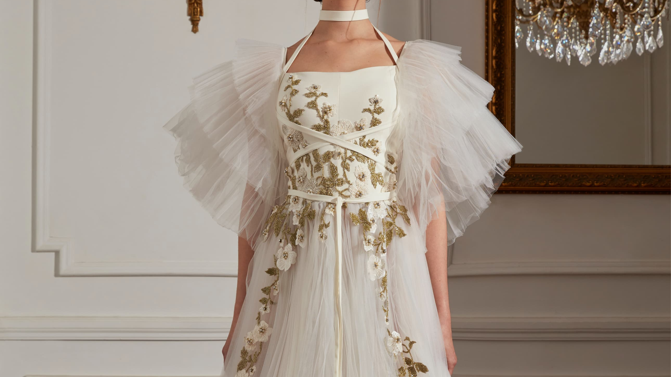 This collection features intricate hand-embroidered bee motifs, luxurious crepe, lace, and tulle fabrics, gold and silver handcrafted accessories, and structured yet flowing silhouettes, all brought together in a regal palette of gold, white, and soft grays, embodying elegance and strength.