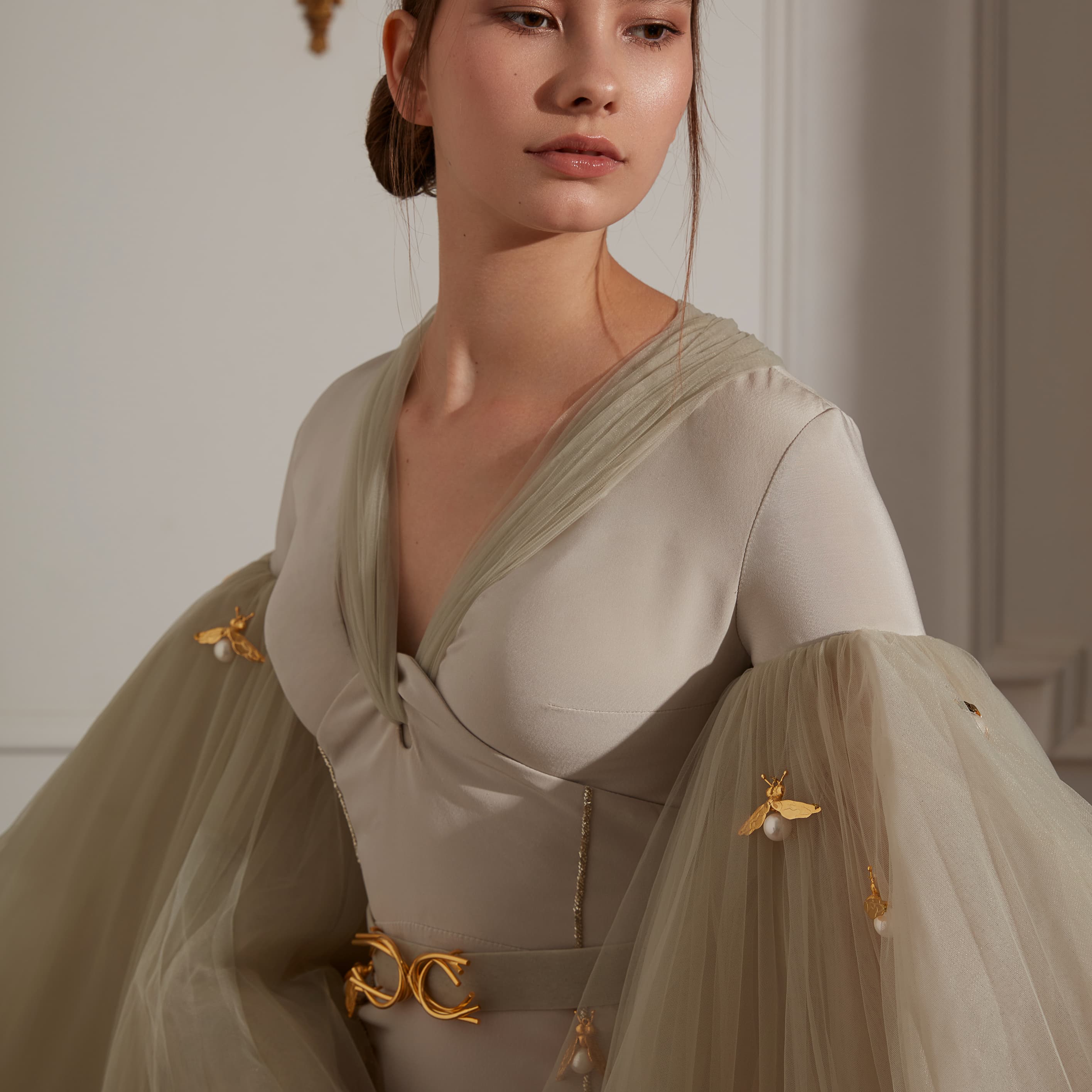 Inspired by the hierarchy and unity of bees, this collection symbolizes power, organization, and royalty—all embodied in the Queen Bee. Just as the Queen orchestrates her hive with precision and grace, the Shahira Lasheen woman leads with confidence, elegance, and strength. The designs reflect this structured yet fluid harmony, showcasing the balance between discipline and beauty.